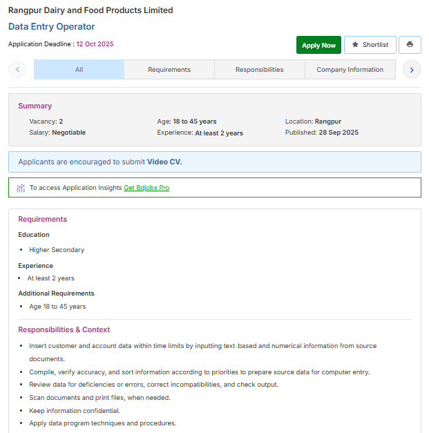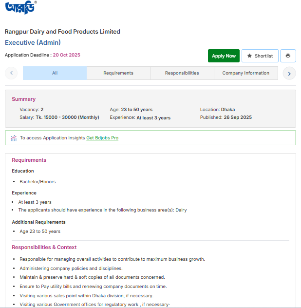এক নজরে Rangpur Dairy & Food Products Ltd job circular 2025