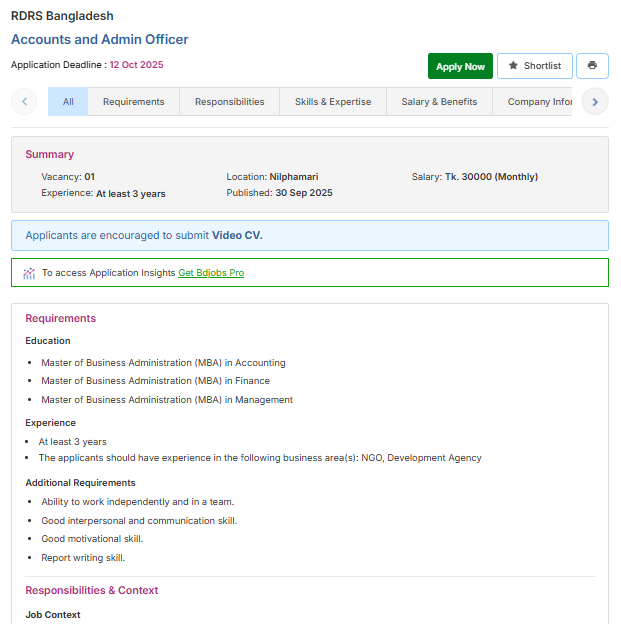 RDRS Job Circular সবসময় চাকরিপ্রার্থীদের জন্য একটি বিশ্বস্ত ভরসা। এবার নীলফামারীতে Accounts and Admin Officer পদে নিয়োগ বিজ্ঞপ্তি প্রকাশ করেছে সংস্থাটি। যদি আপনার যোগ্যতা ও অভিজ্ঞতা মিলে যায়, তাহলে এখনই আবেদন করুন। ক্যারিয়ারের নতুন সম্ভাবনার দরজা খুলে দিতে পারে এই চাকরি।