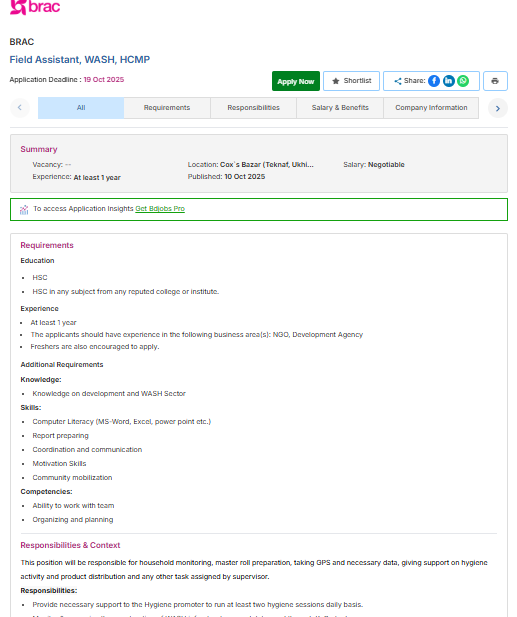 অর্থাৎ যারা গ্রামীণ বা উপকূলীয় এলাকায় থেকেও একটি ভালো চাকরি খুঁজছেন, তাদের জন্য এটি হতে পারে দারুণ সুযোগ। BRAC দীর্ঘদিন ধরে বাংলাদেশের বিভিন্ন অঞ্চলে উন্নয়ন, স্বাস্থ্য, শিক্ষা ও পানি-স্যানিটেশন (WASH) সেক্টরে কাজ করছে।