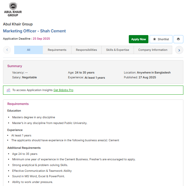 - মার্কেটিং অফিসার (Shah Cement): নির্ধারিত নয়